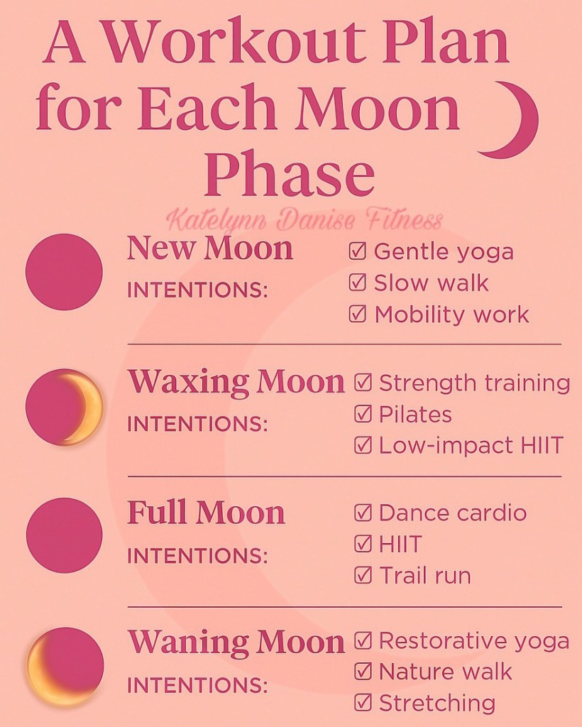 Theme: Rest, inward focus, renewal Your energy: Low, reflective, intuitive Best workouts: Gentle yoga, slow walks, mobility work, breathwork Suggestion: Use this time to journal your fitness goals or set new intentions. Try grounding with bare feet on the earth or a calming yin yoga flow.